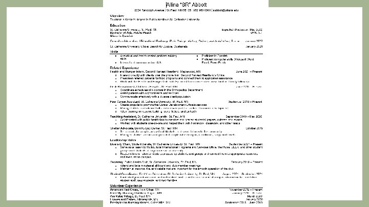 • Exercise a “word dump” • Write shorthand notes of your experience • Professional development? Trainings? • Procedures you engaged in • Newly developed concepts (knowledge based), skills, and abilities • What became second-nature? • Examples of times you took initiative • Unique opportunities Experience Reflection