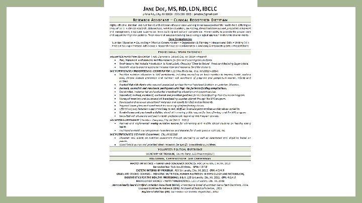 DO NOT USE TEMPLATES Balance of text to blank space Consistent formatting 10 -12 pt font, name 18 -22 Readable font Times New Roman or Arial Right align dates Formatting