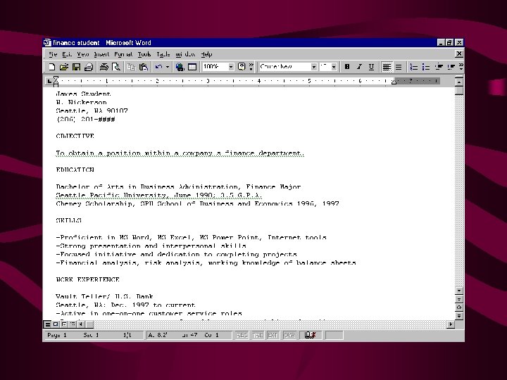 Education Example • Bachelor of Arts in Business Administration, Emphasis in Marketing • Seattle Pacific University, Seattle WA, Anticipated Graduation June 2001 • Major GPA: 3. 6 Deans List 6 out of 7 quarters • Related Coursework: _____, _____