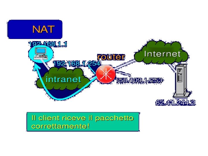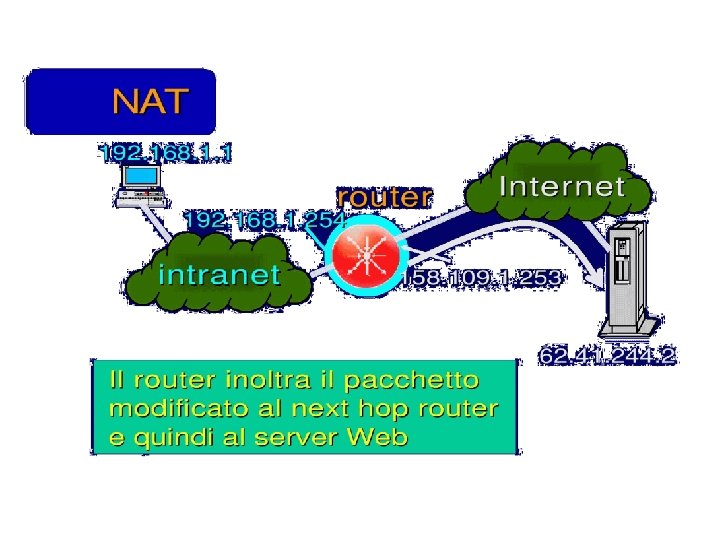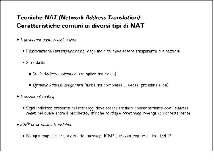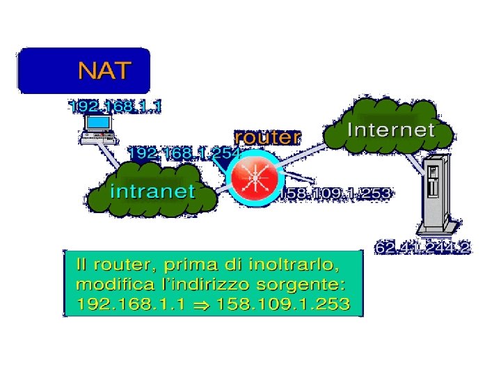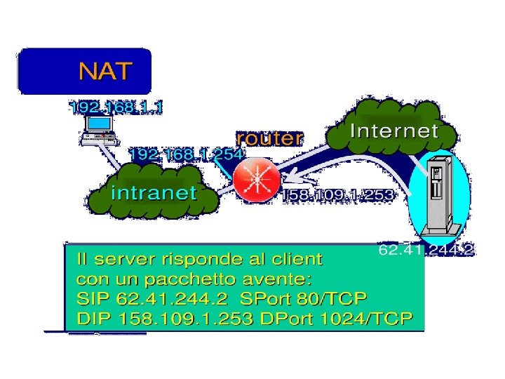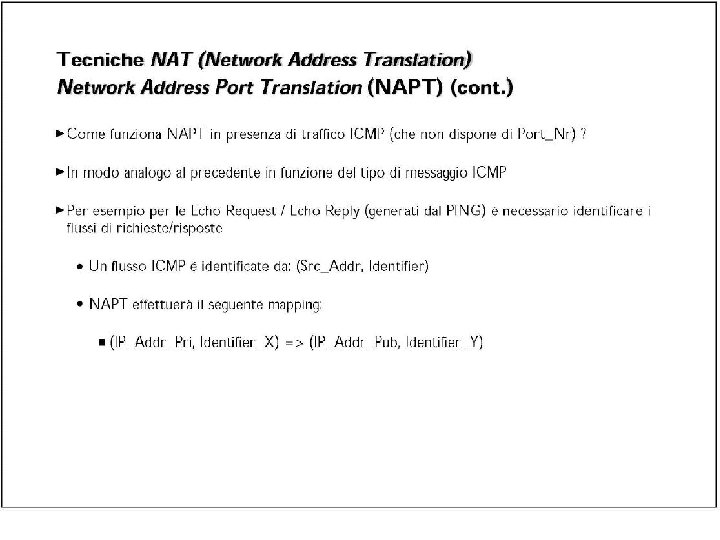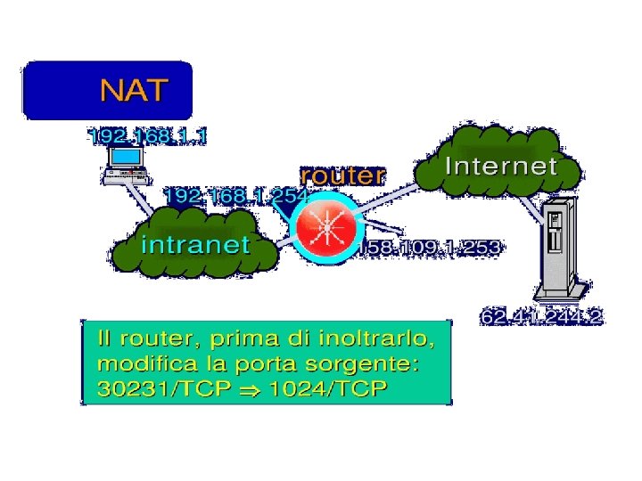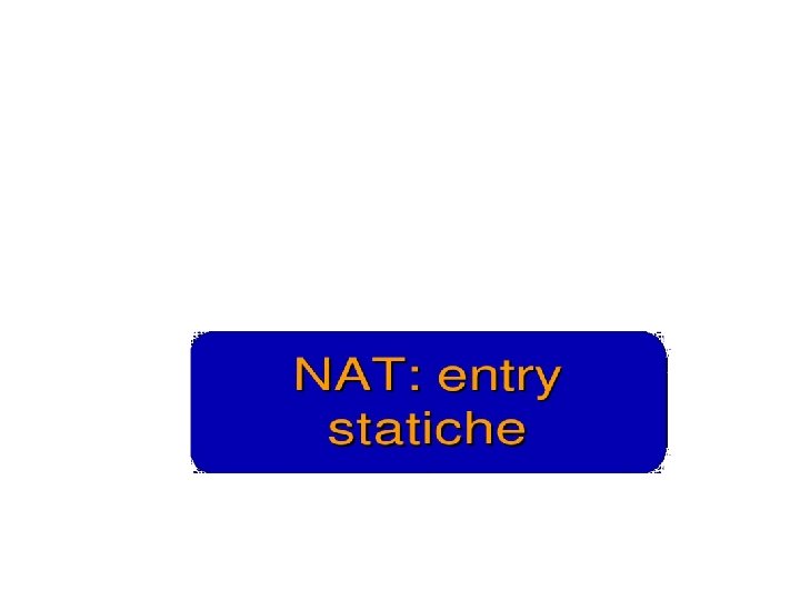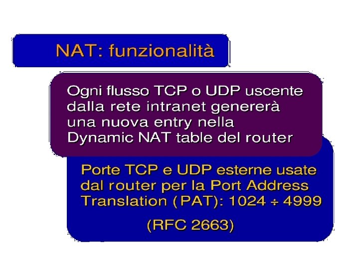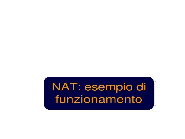 Esercizio UDP DPort: 30000 S Echo request Internal Address Realm External Address Realm Echo request NAT UDP SPort: X C Echo reply Private IP addresses: 192. 168. 1. x Echo reply You can use public IP addresses or other private IP addresses: 10. 0. 1. x