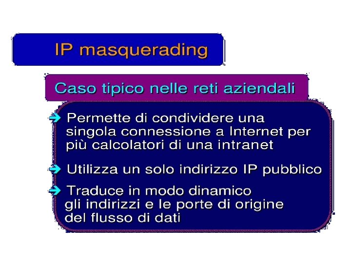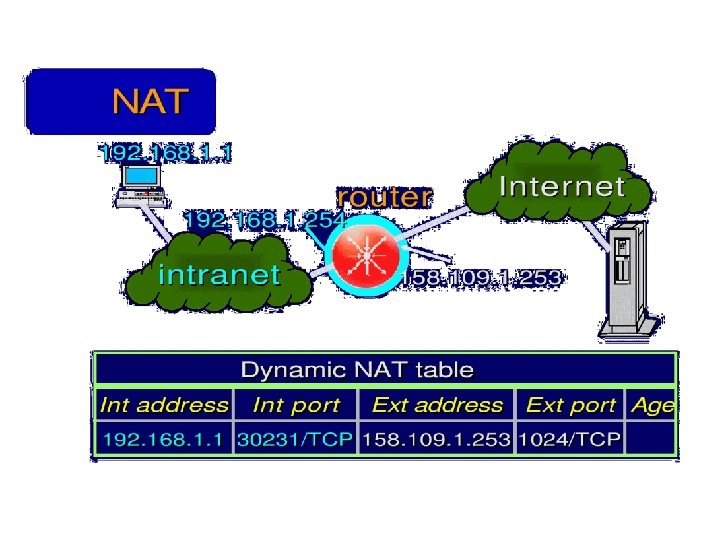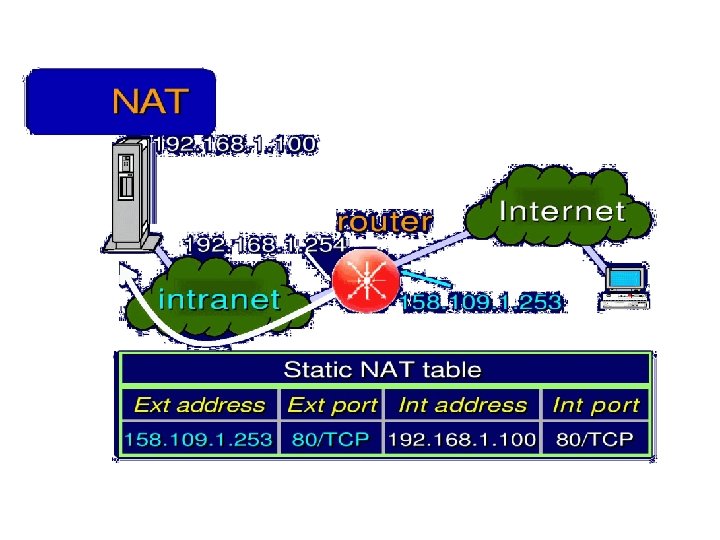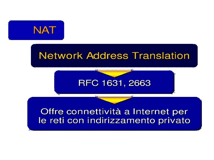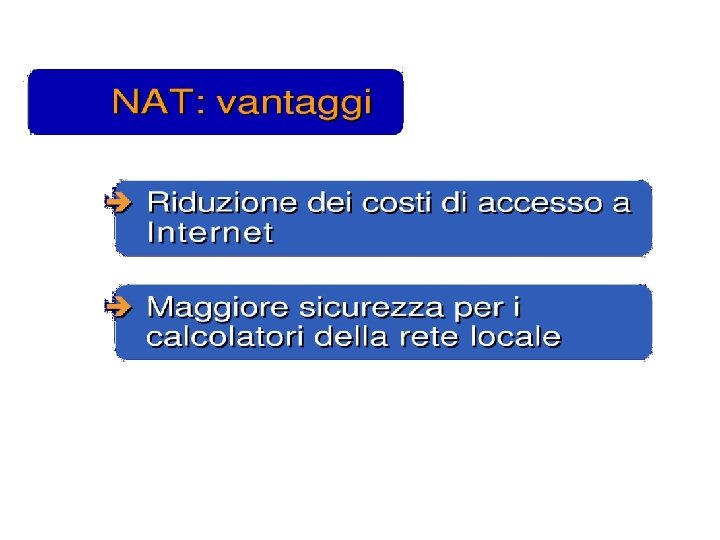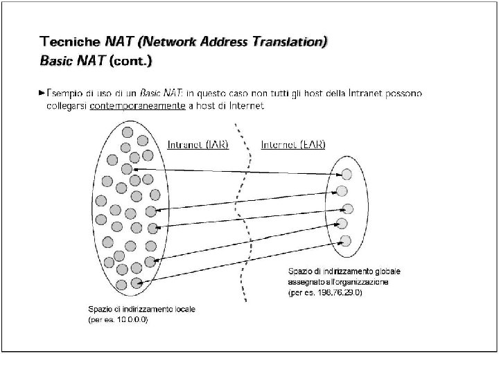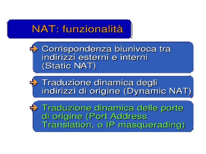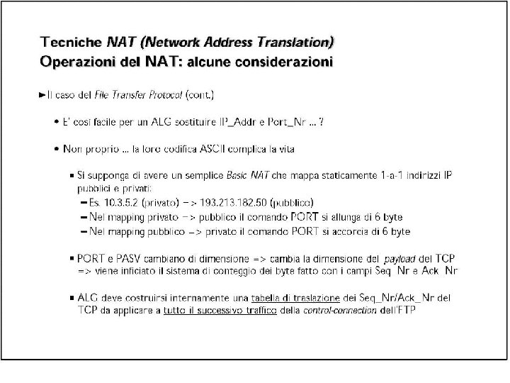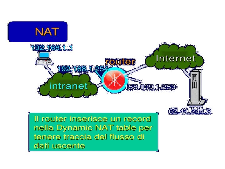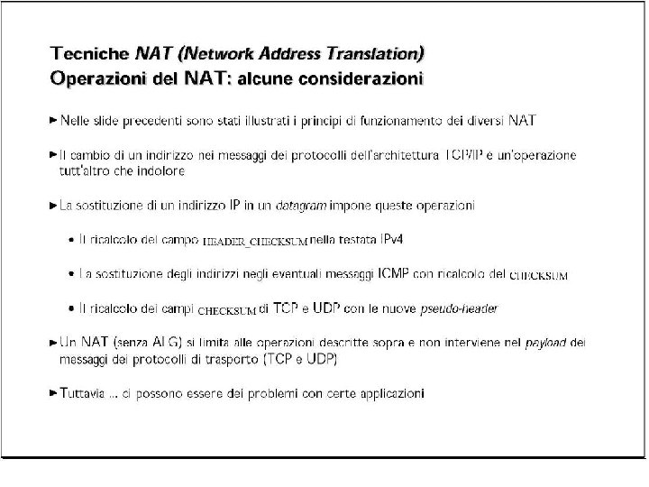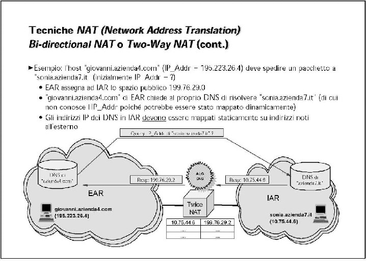 Esercizio UDP DPort: 30000 S Echo request Internal Address Realm External Address Realm Echo request NAT UDP SPort: X C Echo reply Private IP addresses: 192. 168. 1. x Echo reply You can use public IP addresses or other private IP addresses: 10. 0. 1. x