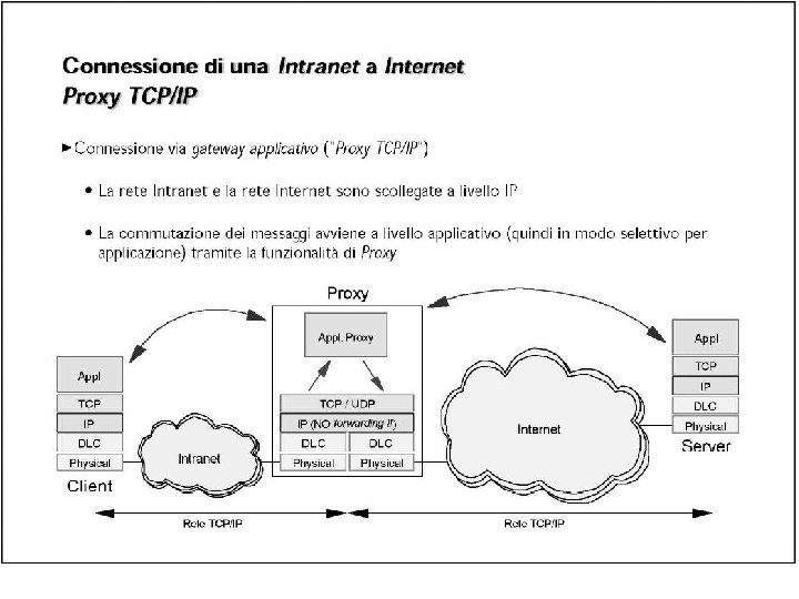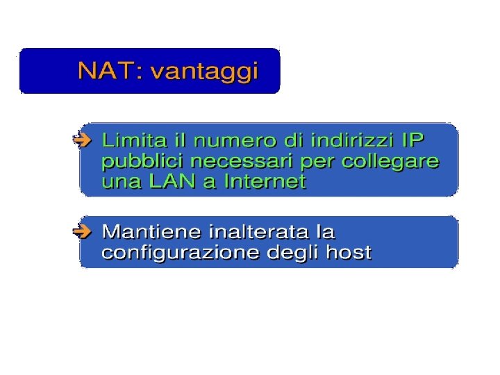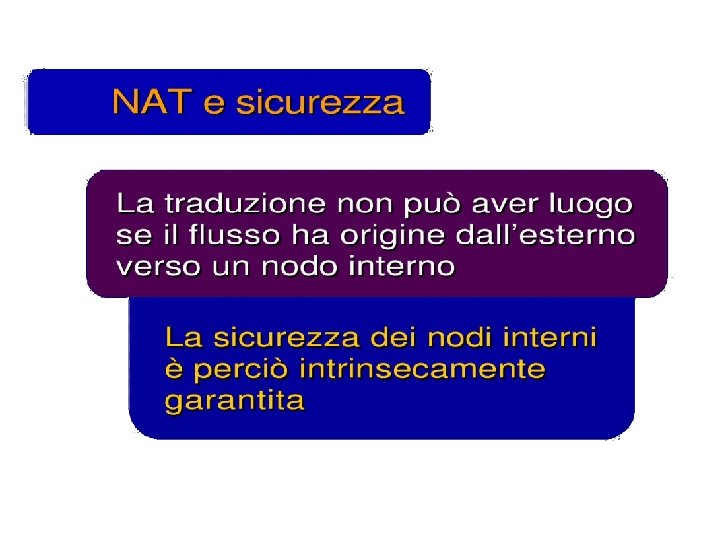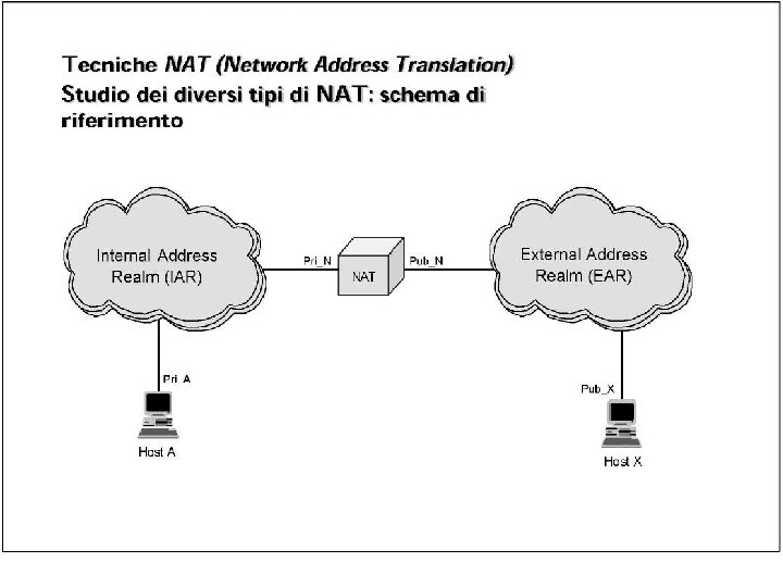 Classificazione dei NAT relativamente alla “apertura” • Full Cone: A full cone NAT is one where all requests from the same internal IP address and port are mapped to the same external IP address and port. Furthermore, any external host can send a packet to the internal host, by sending a packet to the mapped external address. • Restricted Cone: A restricted cone NAT is one where all requests from the same internal IP address and port are mapped to the same external IP address and port. Unlike a full cone NAT, an external host (with IP address X) can send a packet to the internal host only if the internal host had previously sent a packet to IP address X. • Port Restricted Cone: A port restricted cone NAT is like a restricted cone NAT, but the restriction includes port numbers. Specifically, an external host can send a packet, with source IP address X and source port P, to the internal host only if the internal host had previously sent a packet to IP address X and port P. • Symmetric: A symmetric NAT is one where all requests from the same internal IP address and port, to a specific destination IP address and port, are mapped to the same external IP address and port. If the same host sends a packet with the same source address and port, but to a different destination, a different mapping is used. Furthermore, only the external host that receives a packet can send a UDP packet back to the internal host.