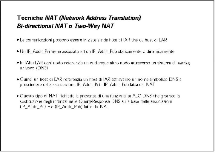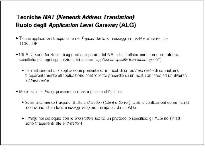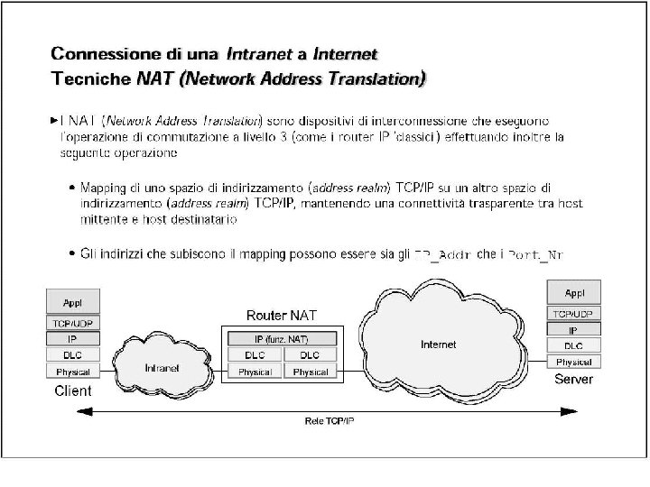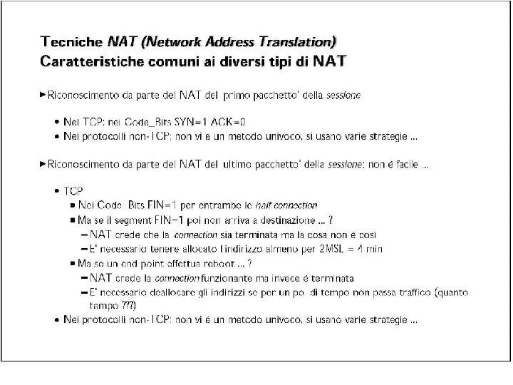 Comunicazioni attraverso i NAT • L’apertura o meno di un NAT influenza le possibilità di comunicazione degli host che stanno dietro ad un NAT. • Nelle comunicazioni client-server, quando il server si trova su IP pubblico e il client dietro un NAT, non ci sono problemi particolari (specialmente con TCP). • Il problema riguarda le comunicazioni “end-to-end” (ad esempio per flussi UDP multimediali) che coinvolgono host dietro ai NAT. Se entrambi gli host sono dietro ai NAT, in certi casi non è possibile stabilire delle comunicazioni dirette.