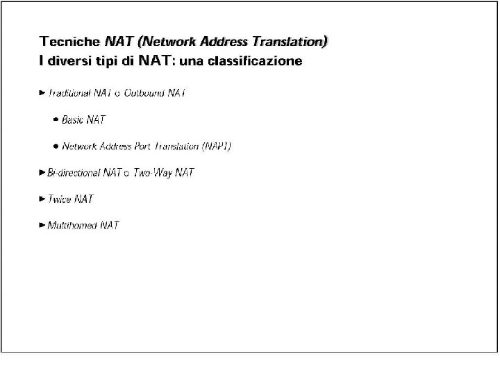 Classificazione dei NAT relativamente alla “apertura” • I Nat si differenziano a secondo delle possibilità di accesso che offrono alle connessioni “entranti” • È in realtà difficile fornire una classificazione semplice e completa di tutti i possibili NAT • Nella RFC 3489 “STUN - Simple Traversal of User Datagram Protocol (UDP) Through Network Address Translators (NATs)” i NAT vengono classificati in: – – Full cone Restricted Cone Port restricted Cone Symmetric