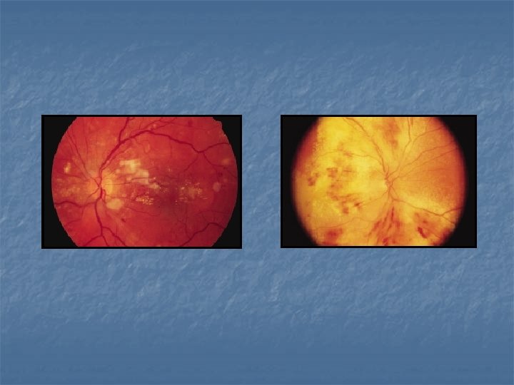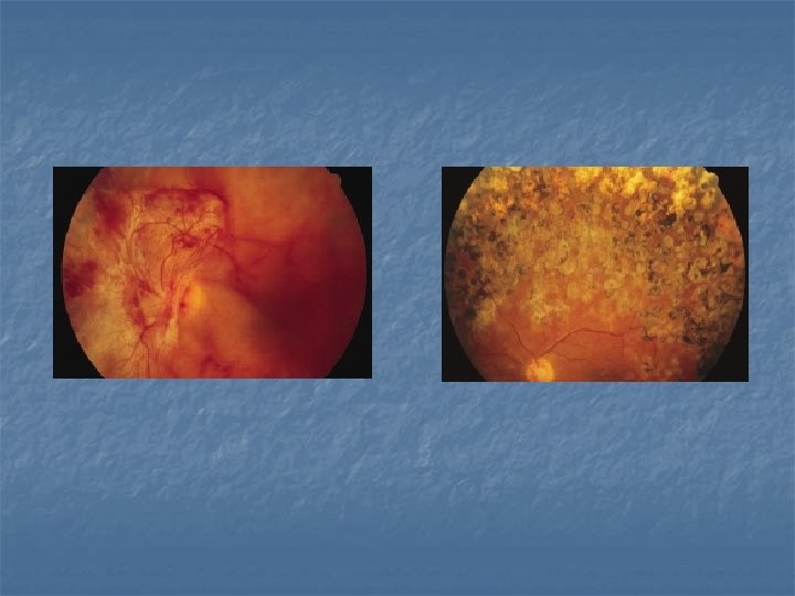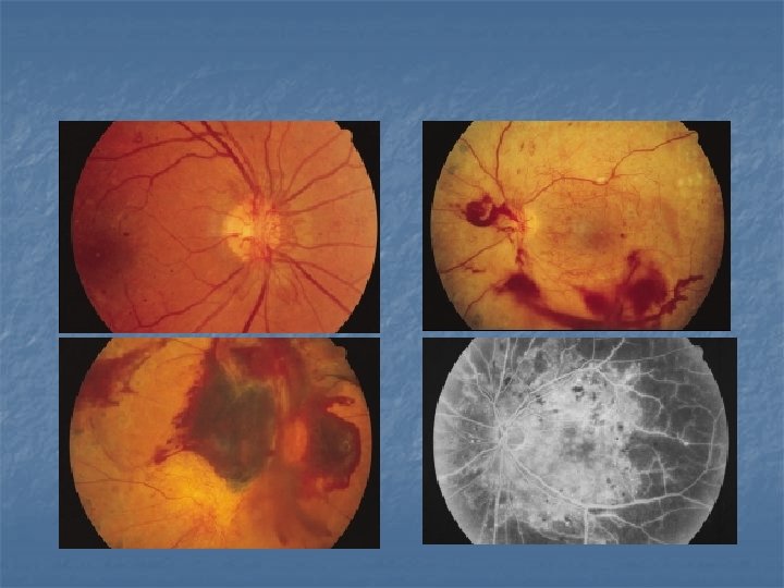 DIABETIC RETINOPATHY-Stages n Nonproliferative diabetic retinopathy (NPDR) n n n Microaneurysms, dot-and-blot hemorrhages, hard exudates, retinal edema, dilation and beading of retinal veins, intraretinal microvascular abnormalities (IRMA), nerve fiber layer infarcts, arteriolar abnormalities, and areas of capillary nonperfusion Mild, moderate, severe, very severe Proliferative diabetic retinopathy (PDR) Neovascularization on the optic disc or elsewhere on the retinal surface, vitreous hemorrhage and tractional retinal detachment Early, high-risk, advanced