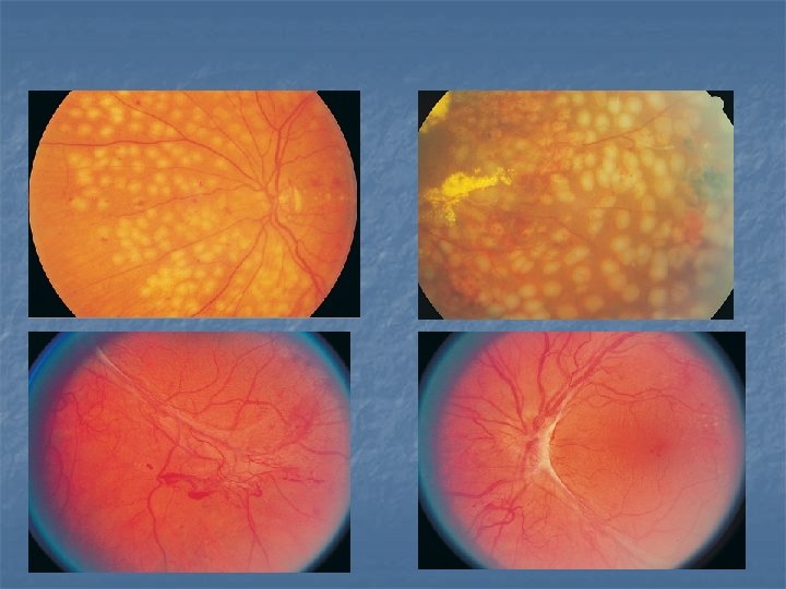 RETINAL VASCULAR DISEASES n n Diabetic retinopathy Retinal vein occlusion Branch Central n Retinal artery occlusion Branch Cilioretinal Central n n n Hypertensive retinopathy Sickle-cell retinopathy Retinopathy of prematurity Retinal telangiectasias Retinal artery macroaneurysm Radiation retinopathy