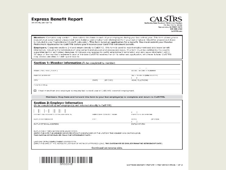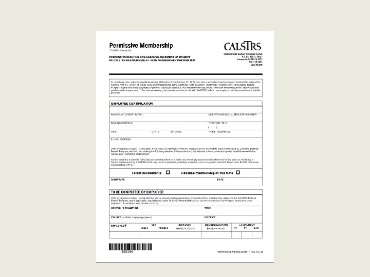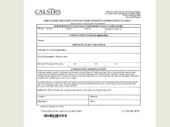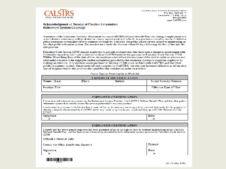 PERS - Election ØQualifying Elections: • Cal-PERS member hired for qualifying certificated STRS position • 60 days to elect to stay in Cal-PERS üMust meet other requirements • Use Form ES-372 ü Not required to return form unless electing into ü Should retain written acknowledgement of form (ES-373) • Forward Form to County Office for Review