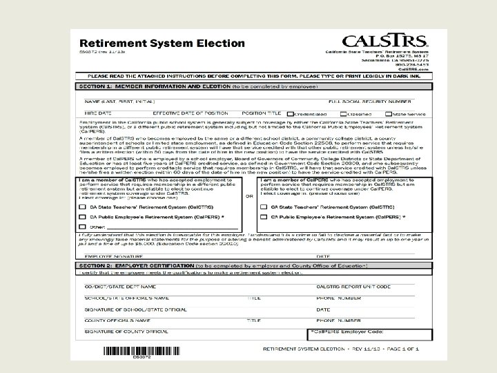 STRS - Election (See Join Cal. STRS? Join Cal. PERS? ) • Cal. STRS Member in PERS Qualifying Classified Position • 60 Days to Elect to Stay in STRS • New ES-372 Form for Election ØCal. PERS Member in STRS Qualifying Certificated Position • 60 Days to Elect to Stay in PERS • New ES-372 Form for Election