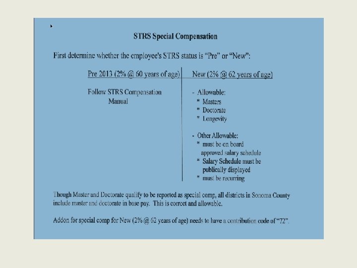 STRS – Compensation (See Cal. STRS Directive 2014 -01) Ø Creditable: Ed Code 22119. 5, 22119. 2 and 22119. 3 (PEPRA has been added) • Contributions on Service in Excess of One Year: ü ü Creditable to the Defined Benefit Supplemental (DBS) Program Not Used in the Calculation for Final Compensation Purposes