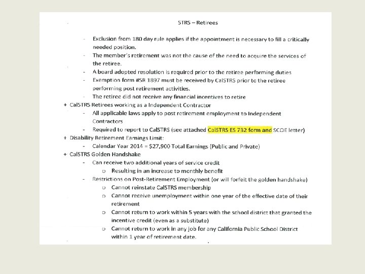 STRS – Retirees ØCal. STRS Retirees can Work: • Earnings Limitations • FY 13/14 = $39, 903 • FY 14/15 = $40, 173 • After January 1, 2013, must wait 180 days before returning to work with a Cal. STRS employer üWill reduce their retirement benefit dollar for dollar by an amount equal to their earnings • Can Work as Classified Instructional Aide Only (Ed Code 45134) üWatch Payroll Reporting