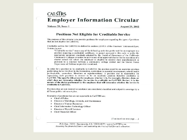 Which Retirement System? ØBased on Position not the Person • STRS: üRequires Credential, Permit or Certificate § Teachers, Administrators, Nurses, Psychologist • PERS: üNon-Credential, Meets PERS Qualification § Bus Drivers, Office Staff, Instructional Aides § Director of Human Resources, Chief Financial Officer üSee Circular in Concepts Docs for Examples