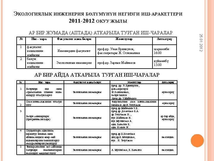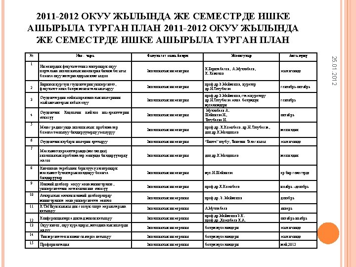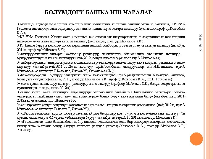 25. 01. 2012 Ø ‘Jeoekoloji’ bilim dalında bilimsel savunma kurulunda uzman üye olarak katılımı, ‘Toprak bilimleri’ bilim dalında uzmanlar kurulunun başkanı olarak görevlendirme. (Kırgız Cumhuriyetinin Atestasyon Komisyonu) Prof. Dr. Zarlık Maymekov, Prof. Dr. Kanatbek Kocobayev; Ø Kırgız Cumhuriyetinin Mühendislik Akademisinin üyeleri olarak ilgili komisyonlarda görevlendirme. Prof. Dr. Zarlık Maymekov, Prof. Dr. Kanatbek Kocobayev; Ø Devlet Sınavların düzenlenmesi ve yapılması sırasında üye olarak görevlendirme. (Kırgız Teknik Üniversitesi, Kırgız Milli Üniversitesi); Ø Kırgız Cumhuriyeti Terim Komisyonunda üye ve başkan yardımcısı olarak görevlendirme. Prof. Dr. Kanatbek Kocobayev; Ø Mühendislik Fakültesi ve Fen Bilimler Enstitüsünün yönetim kurullarında üye olarak görevlendirme.