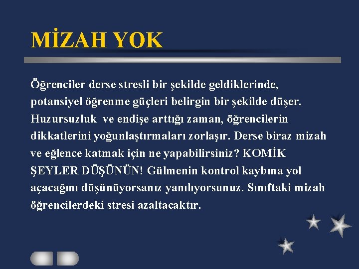 MİZAH YOK Öğrenciler derse stresli bir şekilde geldiklerinde, potansiyel öğrenme güçleri belirgin bir şekilde düşer. Huzursuzluk ve endişe arttığı zaman, öğrencilerin dikkatlerini yoğunlaştırmaları zorlaşır. Derse biraz mizah ve eğlence katmak için ne yapabilirsiniz? KOMİK ŞEYLER DÜŞÜNÜN! Gülmenin kontrol kaybına yol açacağını düşünüyorsanız yanılıyorsunuz. Sınıftaki mizah öğrencilerdeki stresi azaltacaktır.
