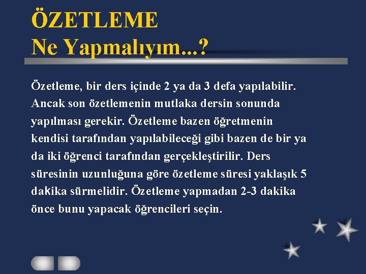 ÖZETLEME Ne Yapmalıyım. . . ? Özetleme, bir ders içinde 2 ya da 3 defa yapılabilir. Ancak son özetlemenin mutlaka dersin sonunda yapılması gerekir. Özetleme bazen öğretmenin kendisi tarafından yapılabileceği gibi bazen de bir ya da iki öğrenci tarafından gerçekleştirilir. Ders süresinin uzunluğuna göre özetleme süresi yaklaşık 5 dakika sürmelidir. Özetleme yapmadan 2 -3 dakika önce bunu yapacak öğrencileri seçin.