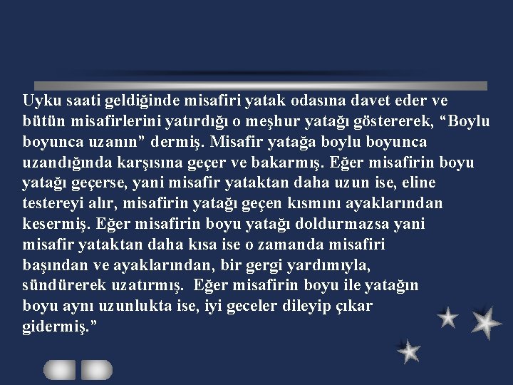 Uyku saati geldiğinde misafiri yatak odasına davet eder ve bütün misafirlerini yatırdığı o meşhur yatağı göstererek, “Boylu boyunca uzanın” dermiş. Misafir yatağa boylu boyunca uzandığında karşısına geçer ve bakarmış. Eğer misafirin boyu yatağı geçerse, yani misafir yataktan daha uzun ise, eline testereyi alır, misafirin yatağı geçen kısmını ayaklarından kesermiş. Eğer misafirin boyu yatağı doldurmazsa yani misafir yataktan daha kısa ise o zamanda misafiri başından ve ayaklarından, bir gergi yardımıyla, sündürerek uzatırmış. Eğer misafirin boyu ile yatağın boyu aynı uzunlukta ise, iyi geceler dileyip çıkar gidermiş. ”