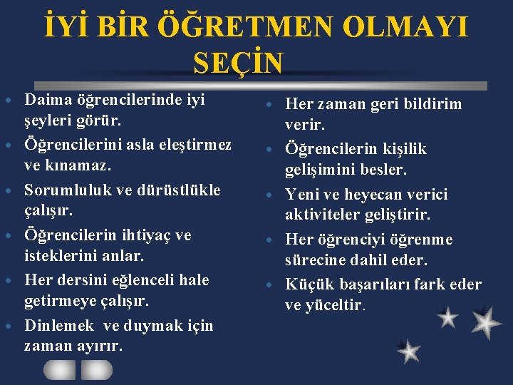 İYİ BİR ÖĞRETMEN OLMAYI SEÇİN · · · Daima öğrencilerinde iyi şeyleri görür. Öğrencilerini asla eleştirmez ve kınamaz. Sorumluluk ve dürüstlükle çalışır. Öğrencilerin ihtiyaç ve isteklerini anlar. Her dersini eğlenceli hale getirmeye çalışır. Dinlemek ve duymak için zaman ayırır. · · · Her zaman geri bildirim verir. Öğrencilerin kişilik gelişimini besler. Yeni ve heyecan verici aktiviteler geliştirir. Her öğrenciyi öğrenme sürecine dahil eder. Küçük başarıları fark eder ve yüceltir.