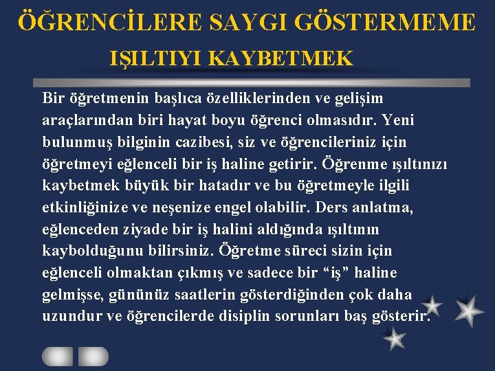 ÖĞRENCİLERE SAYGI GÖSTERMEME IŞILTIYI KAYBETMEK Bir öğretmenin başlıca özelliklerinden ve gelişim araçlarından biri hayat boyu öğrenci olmasıdır. Yeni bulunmuş bilginin cazibesi, siz ve öğrencileriniz için öğretmeyi eğlenceli bir iş haline getirir. Öğrenme ışıltınızı kaybetmek büyük bir hatadır ve bu öğretmeyle ilgili etkinliğinize ve neşenize engel olabilir. Ders anlatma, eğlenceden ziyade bir iş halini aldığında ışıltının kaybolduğunu bilirsiniz. Öğretme süreci sizin için eğlenceli olmaktan çıkmış ve sadece bir “iş” haline gelmişse, gününüz saatlerin gösterdiğinden çok daha uzundur ve öğrencilerde disiplin sorunları baş gösterir.