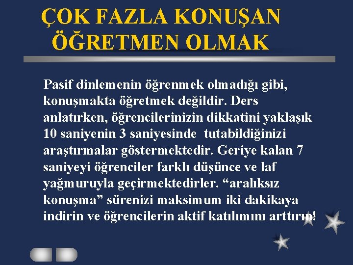 ÇOK FAZLA KONUŞAN ÖĞRETMEN OLMAK Pasif dinlemenin öğrenmek olmadığı gibi, konuşmakta öğretmek değildir. Ders anlatırken, öğrencilerinizin dikkatini yaklaşık 10 saniyenin 3 saniyesinde tutabildiğinizi araştırmalar göstermektedir. Geriye kalan 7 saniyeyi öğrenciler farklı düşünce ve laf yağmuruyla geçirmektedirler. “aralıksız konuşma” sürenizi maksimum iki dakikaya indirin ve öğrencilerin aktif katılımını arttırın!