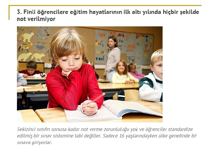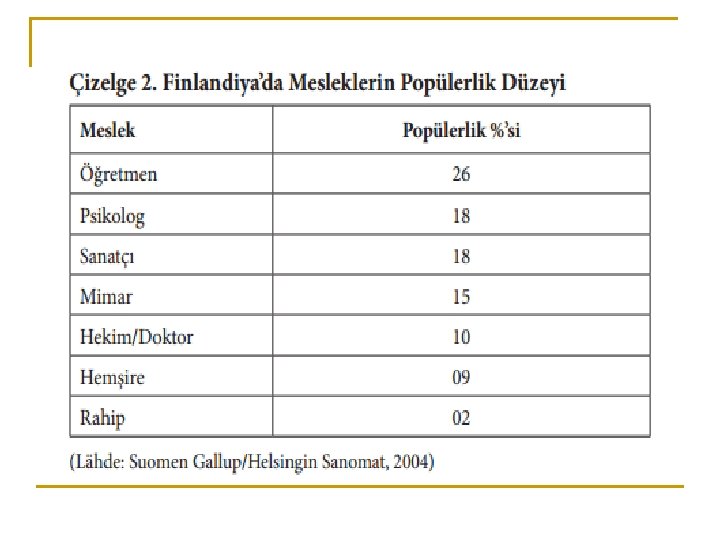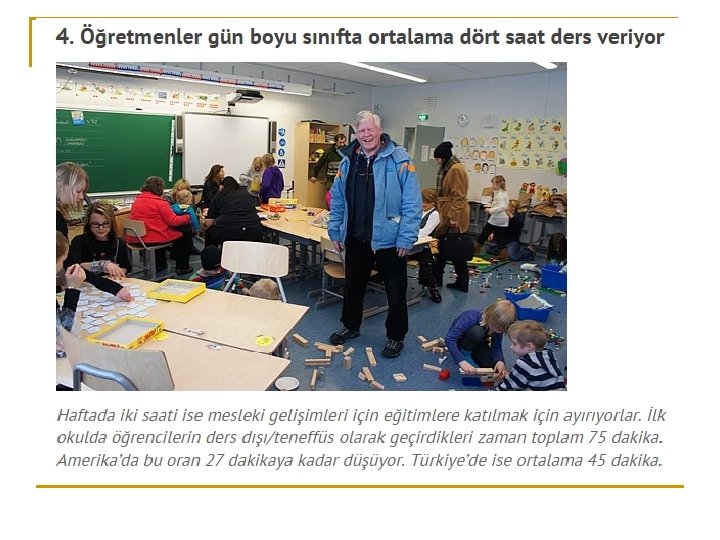 n Finlandiya da öğretmenler: n Öğretmen eğitimi araştırma temellidir. Finlandiya’da öğretmenlik mesleği saygın mesleklerin başında gelmekte olup, ülkenin en başarılı öğrencileri öğretmen olmak için yarışmaktadır. Öğretmenlik mesleğine karşı bu pozitif toplumsal ve kültürel bakış, öğretmenlik mesleğinin saygınlığını artırmakta ve nitelikli öğretmenlerin eğitim kadrosuna katılmasını sağlamaktadır. Eğitim fakülteleri kontenjanlarını öğretmen ihtiyacına göre sınırlayarak hem nitelikli öğrencilerin tercihini sağlamakta hem de iş güvencesi yüksek öğretmen adayları yetiştirmektedir.