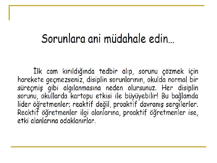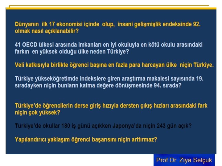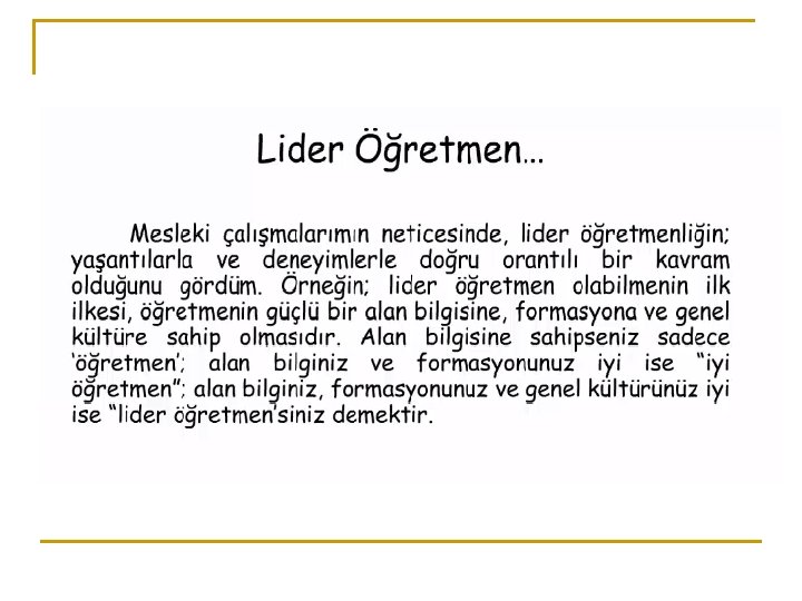 Öğretmenin öğrenme üzerindeki etkisi • Pek çok deneysel çalışma, öğretmenin öğrenci başarısı üzerinde büyük bir etkiye sahip olduğunu göstermektedir. (Bkz. Hattie; Rowe; Mulford) Varyansın Açıklanması (Hattie*) Öğrenci % 50 Ev % 5 – 10 Okul % 5 – 10 Akran Grubu % 5 – 10 Öğretmen % 30 • Hattie J. (2003). Teachers Make a Difference: What is the Research Evidence?