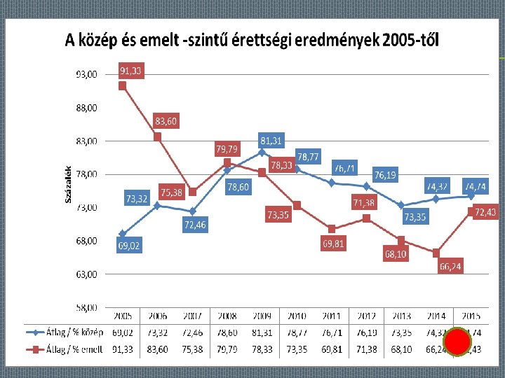 OSZTÁLYOK ÉRETTSÉGI EREDMÉNYE 12. A 12. B 12. C 12. D 12. E Közép % 70, 31 82, 95 68, 79 84, 98 81. 05 Emelt % 70, 35 78, 72 71, 76 80, 29 78, 1 4, 23 -2, 97 4, 69 2, 95 eltérés -0, 04