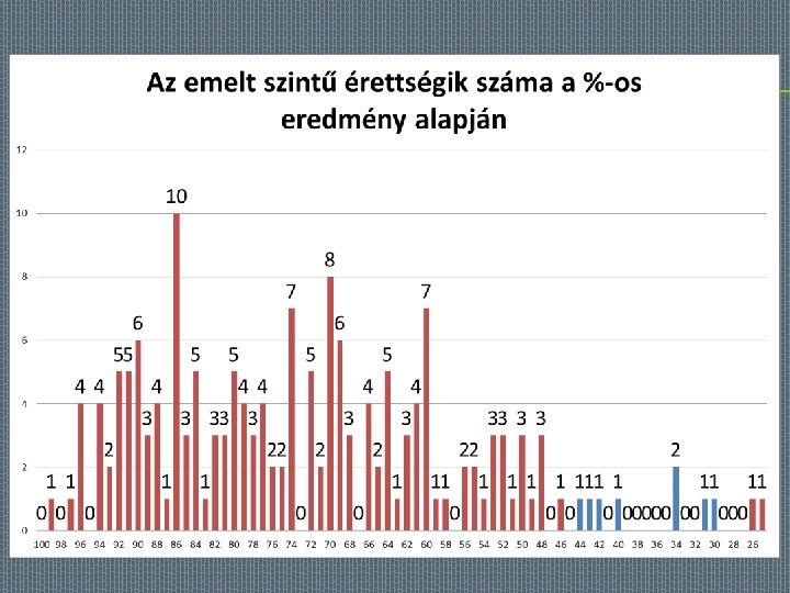 TANULÓK SZÁMA AZ ÉRETTSÉGI SZÁZALÉKOS ÁTLAGEREDMÉNYE ALAPJÁN 60 52 45 50 40 28 23 30 14 20 10 9 0 40%-50% 50%-60% 60%-70% 70%-80% 80%-90% felett