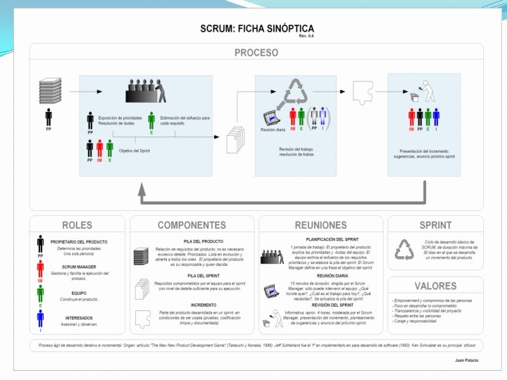Scrum � ¿Qué es exactamente? : Scrum es una metodología, un conjunto de prácticas y roles � ¿Y para que se utiliza? : Se utiliza para el desarrollo del Software concretamente. Por sus características no es válido para cualquier proyecto ni para cualquier persona o equipo de personas. � Scrum, es óptima para equipos de trabajo de hasta 8 personas, aunque hay empresas que lo han utilizado con éxito con equipos más grandes. � Para el 90% de los proyectos y empresas, es una metodología válida, pero no es una metodología válida al 100%. Es más, no hay metodología mejor que otra ni válida al 100% para todas las personas y empresas. � Scrum es una metodología más de las muchas que hay, y ésta en concreto, se basa en la filosofía del desarrollo ágil que fue expuesto por dos japoneses alrededor del año 1986.