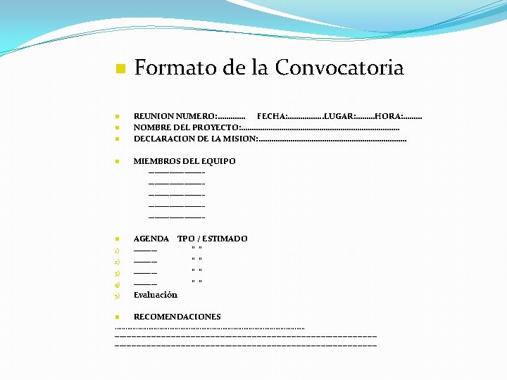 n Formato del Acta de la reunión n REUNION NUMERO: …………. FECHA: ……………. . LUGAR: …………HORA: ……. . NOMBRE DEL PROYECTO: …………………………………. . DECLARACION DE LA MISION: ………………………………. . . n ASISTENTES/INASISTENTES n n 4) ---------------------------AGENDA TPO / ESTIMADO -------“ “ n EVALUACION REUNION n 1) 2) 3) “+ “ “-” RESUMEN BREVE DE TOPICOS, DECISIONES CONCLUSIONES Y PROXIMOS PASOS -----------------------------------------------------------PUNTOS A TRATAR A FUTURO ----------------------------------------------------------------------- PROXIMA REUNION FECHA: …… HORA: ……. LUGAR: ………. PROXIMA AGENDA: -----------------------