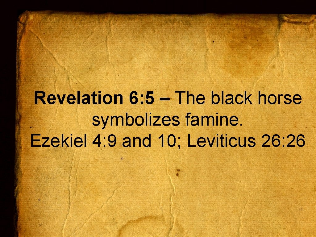 Revelation 6: 5 – The black horse symbolizes famine. Ezekiel 4: 9 and 10; Leviticus 26: 26