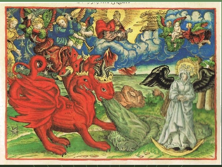 Revelation 12: 1 -3 A great and wondrous sign. Who is the woman? She is Israel—about to give birth to the Messiah She is the Church—about to be persecuted She is God’s kingdom in any of its aspects. Another sign: An enormous red dragon. 7 heads (great wisdom) 10 horns (very powerful) 7 crowns (great authority (on the earth at least)) Satan! Rome! (Rev 17)