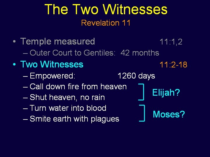 Revelation 11: 4 These are the two olive trees, and the two candlesticks standing before the God of the earth. Revelation 11: 4 Zerubbabel & Joshua, who re-established Israel Zech 4: 10 -14 Continuous filling by the Holy Spirit Zech 4: 12