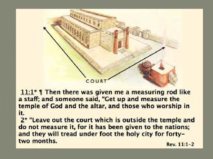 “And there was given me a reed like unto a rod: and the angel stood, saying, Rise, and measure the temple of God, and the altar, and them that worship therein. But the court which is without the temple leave out, and measure it not; for it is given unto the Gentiles: and the holy city shall they tread under foot forty and two months. ” (Revelation 11: 1 -2)