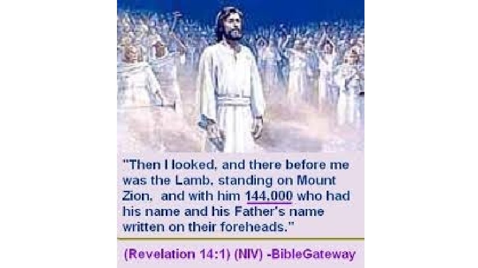 Revelation Chapter 14 • What is significant about the lamb and 144, 000? • His followers • His entourage • The faithful ones • Do you think this is literally meaning only 144, 000 make it to Heaven? • What is significant about Mount Zion?