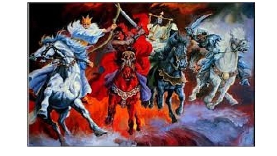 Revelation chapter 6 • 1 st Horseman • 2 nd horseman • 3 rd horseman • 4 th horseman • 5 th seal • 6 th seal • Summary military conquest of Rome War economic hardship following war Death martyred saints seek justice the wrath