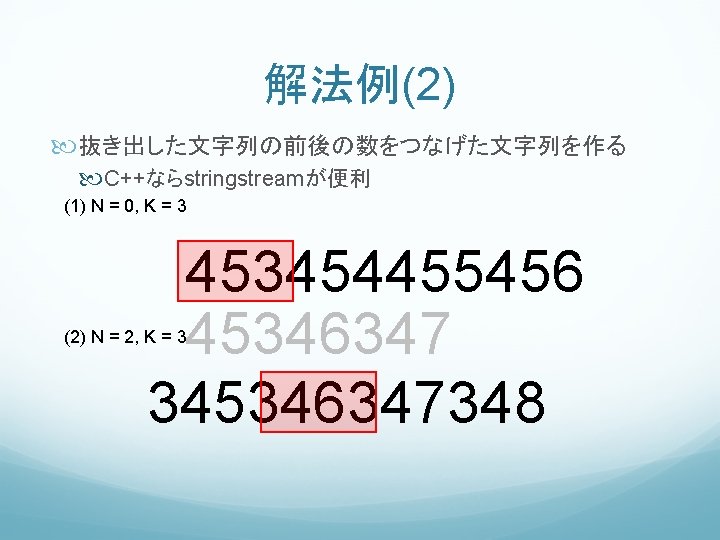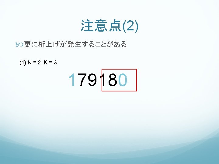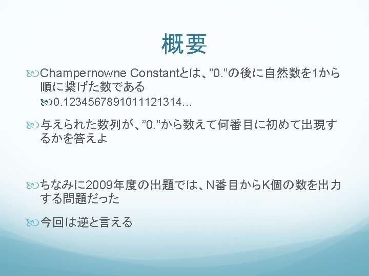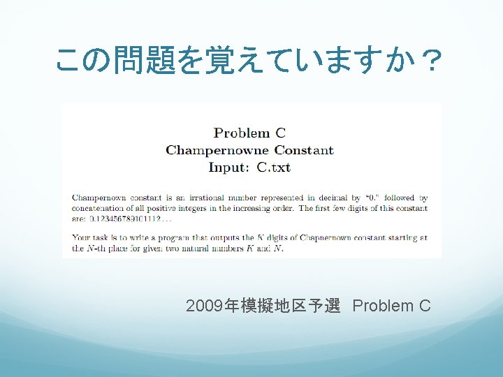 Revenge of Champernowne Constant ororog 3 1 N Slides: 12 Download presentation Revenge of Champernowne Constant 原案: 野田 解答: 橋本・水野 解説:水野(@ororog) 解法例(3) 元の文字列が含まれていれば、その場所を出力 (1) N = 0, K = 3 453454455456 (2) N = 2, K = 3 45346347 match! 345346347348 Judge’s Solution 橋本 70行 (Java) 水野 92行 (C++) 結果 First Submission Wakaba (137 min) First Accepted: Wakaba (141 min) Total Accepted / Submission: Piyo