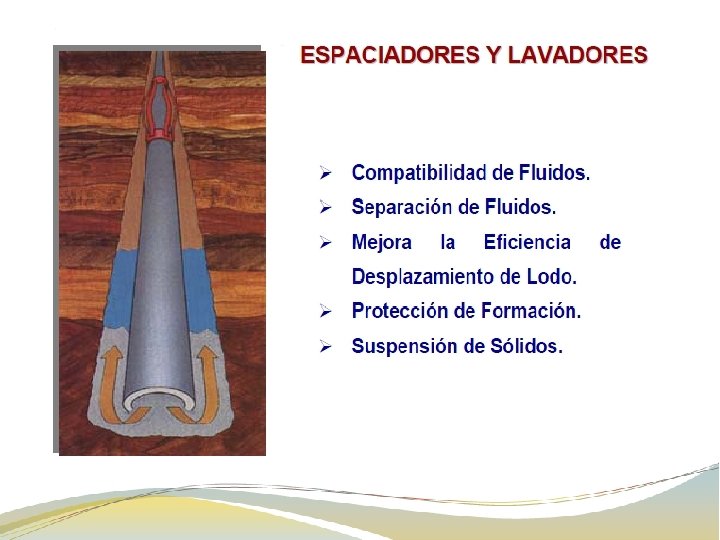 Aditivos C Los aditivos tienen como función adaptar los diferentes cementos petroleros a las condiciones específicas de trabajo. Pueden ser sólidos y/o líquidos (solución acuosa). Entre ellos tenemos: Aceleradores: se usan en pozos donde la profundidad y la temperatura son bajas. Para obtener tiempos de espesamiento cortos y buena resistencia a la compresión en corto tiempo. Pueden usarse: cloruro de calcio (Ca. Cl 2, más usado), silicato de sodio (Na 2 Si. O 3), cloruro de sodio (Na. Cl), ácido oxálico (H 2 C 2 O 4), etc. Retardadores: hacen que el tiempo de fraguado y el desarrollo de resistencia la compresión del cemento sea más lento. Los más usados son: lignitos, lignosulfonato de calcio, ácidos hidroxicarboxílicos, azúcares, derivados celulósicos, etc. Extendedores: se añaden para reducir la densidad del cemento o para reducirla cantidad de cemento por unidad de volumen del material fraguado, con el fin de reducir la presión hidrostática y aumentar el rendimiento (pie 3/saco) de las lechadas. Entre los más usados se tienen: bentonita, silicato de sodio (Na 2 Si. O 3), materiales pozzolánicos, etc. Densificantes: aditivos que aumentan la densidad del cemento o que aumentan la cantidad de cemento por unidad de volumen del material fraguado, con el fin de aumentar la presión hidrostática. Los más usados: barita, hematita, ilmenita, etc. Controladores de Filtrado: aditivos que controlan la pérdida de la fase acuosa del sistema cementante frente a una formación permeable. Previenen la deshidratación prematura de la lechada. Los más usados son: polímeros orgánicos, reductores de fricción, etc. Antiespumantes: ayudan a reducir el entrampamiento de aire durante la preparación de la lechada. Los más usados son: éteres de poliglicoles y siliconas. Dispersantes: se agregan al cemento para mejorar las propiedades de flujo, es decir, reducen la viscosidad de la lechada de cemento. Entre ellos tenemos: polinaftaleno sulfonado, polimelamina sulfonado, lignosulfonatos, ácidos hidrocarboxilicos, polimeros celulósicos.