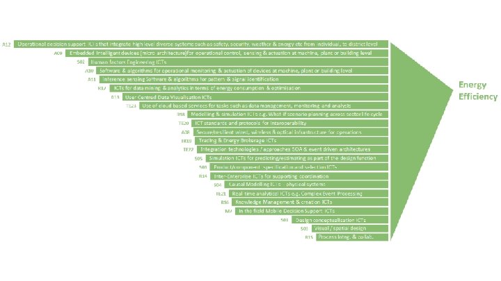 Specification & design ICTs 1. Design conceptualisation 2. Human factors Engineering 3. Visual / spatial design 4. Causal Modelling 5. Simulation design function 6. Specification and selection Materialisation ICTs 7. Mobile Decision Support & realtime communication T Trading management Resource & process management ICTs 14. Inter-Enterprise coordination 15. Business Process Integration & collaboration Specification & 16. Knowledge sharing Materialisation 17. design Data mining & analytics 18. Modelling & simulation across the life cycle S M R Automation & operational decision support ICTs 8. Secure/resilient wired, wireless & optical infrastructure 9. Embedded intelligent devices (micro architecture) 10. Software & algorithms for monitoring/actuation 11. Inference sensing Software & algorithms 12. Operational decision support Automation & 13. User Centred Data Visualisation A operation Support Technical Resource & process management T Technical Integration Trading / Transactional management ICTs 23. Trading & Energy Brokerage 8 19. 20. 21. 22. integration ICTs ICT standards and protocols Real-time analytical technologies Integration technologies / approaches Cloud based services