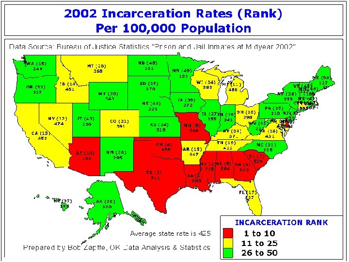 A federal study released Thursday shows that Texas led the nation in the number of inmates incarcerated in state prisons and county jails in June 2003. Texas had 164, 222 inmates on the last day of that month. The Texas inmate population was up by 4. 2 percent, or 6, 578 inmates, from June 2002, according to the study by the U. S. Bureau of Justice Statistics. Texas' June 2003 incarceration rate also was the highest in the nation, with 692 inmates per 100, 000 population. Mississippi ran a close second with an incarceration rate of 688 per 100, 000 residents. . . Overall, the report said the nation's federal, state and local prisons and jails were holding more than 2 million people on June 30, 2003, the largest number in four years.
