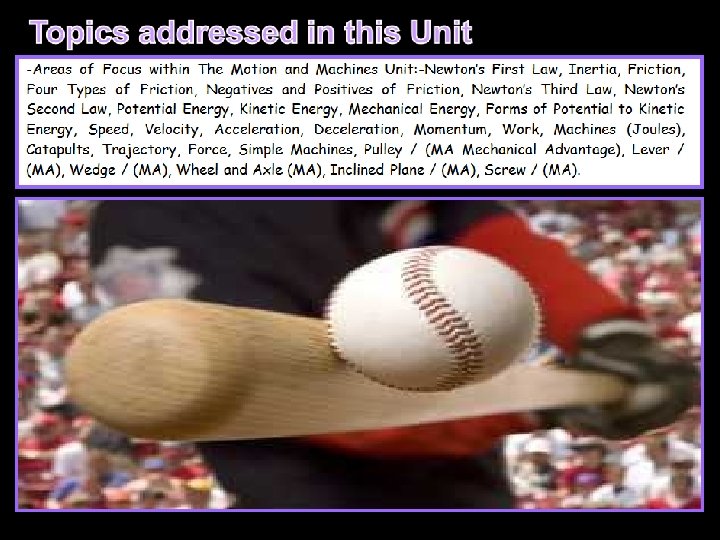 n. Areas of Focus within The Motion and Machines Unit: Newton’s First Law, Inertia, Friction, Four Types of Friction, Negatives and Positives of Friction, Newton’s Third Law, Newton’s Second Law, Potential Energy, Kinetic Energy, Mechanical Energy, Forms of Potential to Kinetic Energy, Speed, Velocity, Acceleration, Deceleration, Momentum, Work, Machines (Joules), Catapults, Trajectory, Force, Simple Machines, Pulley / (MA Mechanical Advantage), Lever / (MA), Wedge / (MA), Wheel and Axle (MA), Inclined Plane / (MA), Screw / (MA) - Mousetrap Cars Link to unit Laws of Motion and Simple Machines Unit