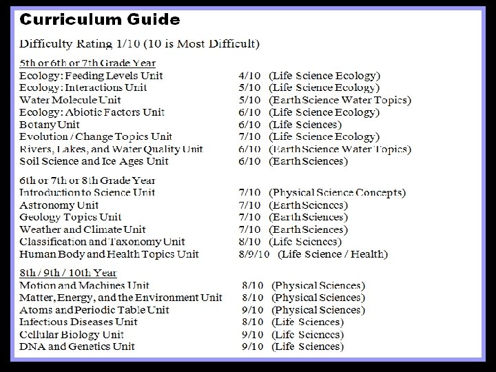 • Please visit the links below to learn more about each of the units in this curriculum and to see previews of each unit. – These units take me four busy years to complete with my students in grades 5 -10. Earth Science Units Extended Tour Link and Curriculum Guide Geology Topics Unit http: //sciencepowerpoint. com/Geology_Unit. html Astronomy Topics Unit http: //sciencepowerpoint. com/Astronomy_Unit. html Weather and Climate Unit http: //sciencepowerpoint. com/Weather_Climate_Unit. html Soil Science, Weathering, More http: //sciencepowerpoint. com/Soil_and_Glaciers_Unit. html Water Unit http: //sciencepowerpoint. com/Water_Molecule_Unit. html Rivers Unit http: //sciencepowerpoint. com/River_and_Water_Quality_Unit. html n= n Easier 5 th – 7 th grade = More Difficult 6 th – 8 th grade = Most Difficult 8 th – 10 th grade