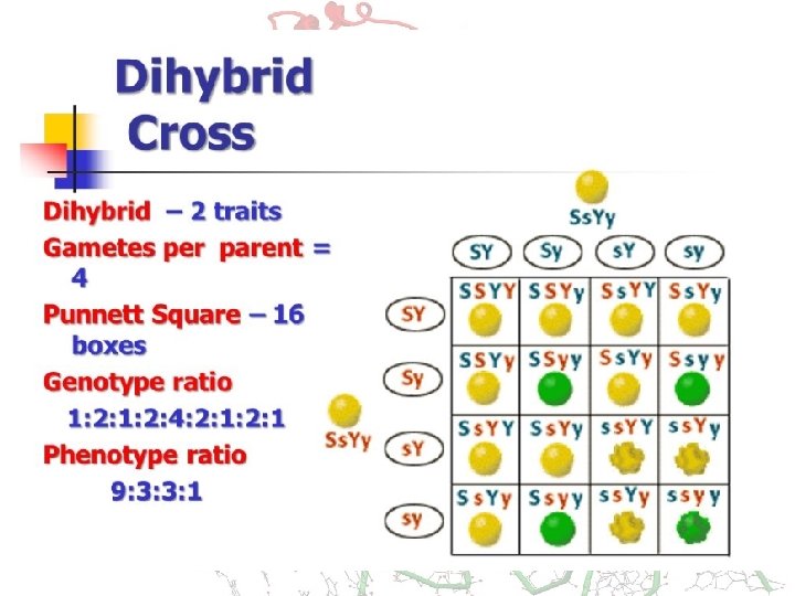 DIHYBRID CROSS • Dihybrid cross is a cross between two pure lines (varieties, strains) that differ in two observed traits. • A genetic cross yielding a 9: 3: 3: 1 ratio of offspring. • In Mendelian sense, between the alleles of both these loci, there is a relationship of complete dominance - recessive