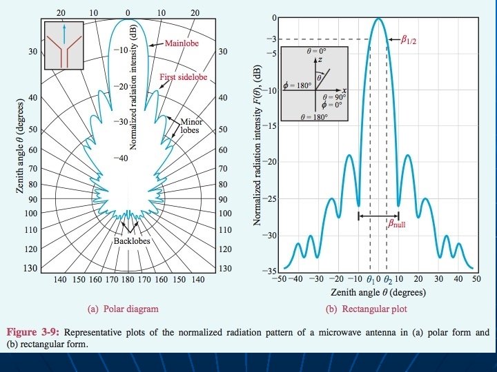 Beamwidth, HPBW n Is the “distance” in radians o degrees between the direction of the radiation pattern where the radiated power is half of the maximum.