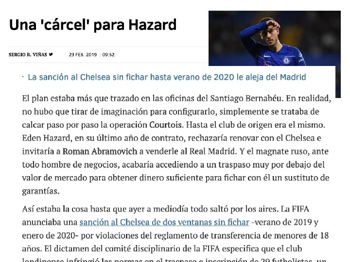 The sanction to the Chelsea without signing up to summer of 2020 takes him away from Madrid The plan was more than drawn in the offices of the Santiago Bernabéu. Actually, it was not necessary to pull imagination to configure it, it was simply to trace the Courtois operation step by step. Even the club of origin was the same. Eden Hazard, in his last year of contract, refused to renew with Chelsea and invited Roman Abramovich to sell to Real Madrid. And the Russian tycoon, above all businessman, would end up agreeing to a transfer far below the market value to get enough money to sign with him a substitute guarantees. So was the thing until yesterday at noon everything jumped through the air. FIFA announced a sanction to the Chelsea of two windows without signing - a date of 2019 and January of 2020 - for violations of the regulation of transfer of minors of 18 years. The opinion of the FIFA disciplinary committee specifies that the London club violated the rules in the transfer and registration of 29 players, a case similar to the one that affected Barcelona, Atlético and Madrid. The first two clubs were also sanctioned with two windows without signing, while the white club saw how the CAS reduced its punishment to only one market.