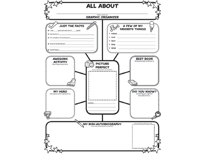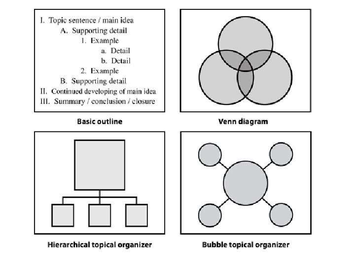 3. Graphic and semantic organizers Graphic organizers illustrate concepts and relationships between concepts in a text or using diagrams. Graphic organizers are known by different names, such as maps, webs, graphs, charts, frames, or clusters. Regardless of the label, graphic organizers can help readers focus on concepts and how they are related to other concepts. Graphic organizers help learners read and understand textbooks and picture books. Graphic organizers can: Help learners focus on text structure "differences between fiction and nonfiction" as they read Provide learners with tools they can use to examine and show relationships in a text Help learners write well-organized summaries of a text