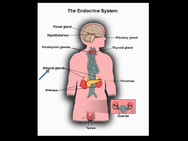 The Endocrine System Composed of a number of glands that release hormones. Hormones travel through the bloodstream and affect different body organs. Endocrine system provides an additional means of communication in the nervous system. The pituitary gland – ‘the Master Gland’ which controls other glands – it is located deep in the middle of the brain in the hypothalamus. The most important gland psychologically is the adrenal gland - adrenaline – the stress hormone. When the brain perceives an event as stressful the Brain stimulates the sympathetic nervous system which instructs the adrenal gland to release the hormone adrenaline.