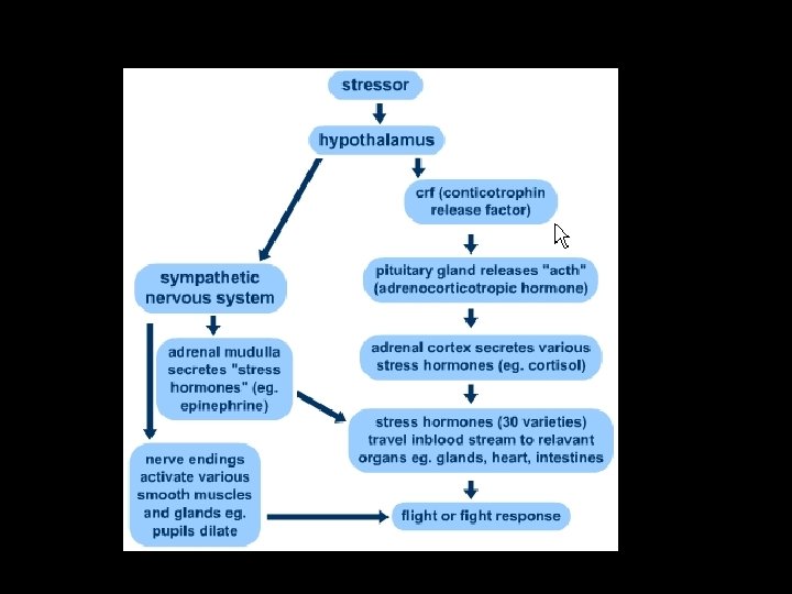 Fight or flight response • Anxiety and fear are actually important for survival because they act as a mechanism to protect the body against stress and danger. • The sympathetic nervous system controls what has been called the "Fight or Flight" phenomenon because of its control over the necessary bodily changes needed when we are faced with a situation where we may need to defend ourselves or escape.
