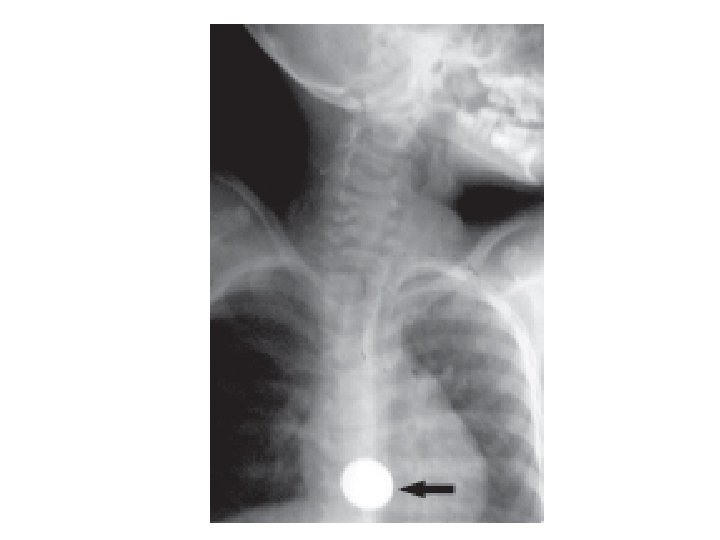 Foreign Body in the Oesophagus • Common sites are the cervical constriction, broncho-aortic constriction and diaphragmatic constriction. • Common foreign object: coin, dentures, bone • Treatment: antibiotics, endoscopic removal, thoracotomy