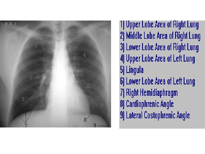 Pleural Effusion • • • Obliteration of the costophrenic angle Obliteration of the cardiophrenic angle Tracheal deviation Meniscus sign Compensatory hyperinflation Causes : heart failure, nephrotic syndrome, cirrhosis, pneumonia, tuberculosis, mesothelioma, bronchogenic CA, SLE, trauma.