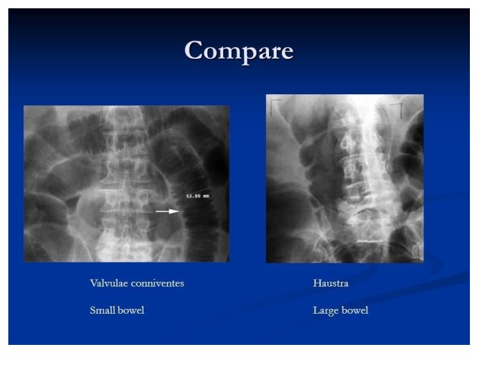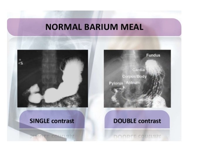 Barium Studies • Barium swallow: used to outline the pharynx and oesophagus. • Barium meal: used to outline the stomach and the first part of the small intestine • Barium follow through: used to outline the small intestine • Barium enema: used to outline the colon