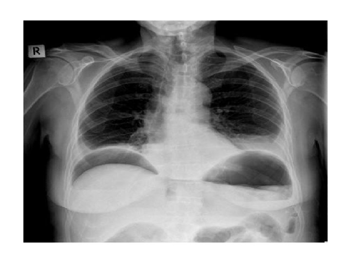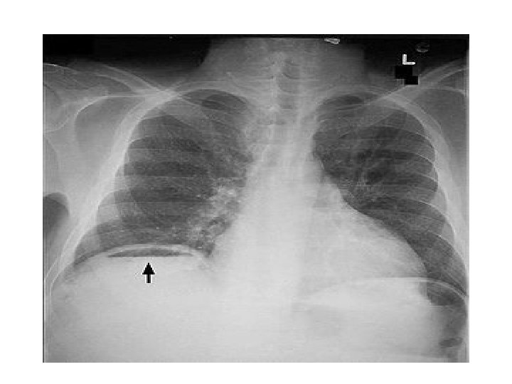 Pneumoperitoneum/ Air under the diaphragm • Erect Chest Xray • Pneumoperitoneum indicates a perforated viscous • Causes : perforated PUD(duodenal ulcer), ruptured appendicitis, typhoid perforation, necrotising enterocolitis, ruptured inflammatory bowel disease, ruptured diverticulitis, bowel cancer, penetrating trauma.